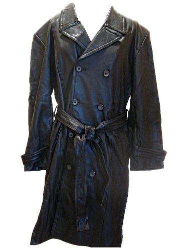 New Yorker trench coat. For the classic, well-dressed look. Butter-soft rich leather. Have to feel the leather to appreciate! Double-breasted. Inside buttons allow the coat to button for both men and women. Full nylon lining. Outside slash pockets -- leather tie belt.