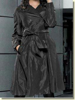 Full skirt fashion double breasted trench in iridescent fabric with fill at top half for added warmth. Details: Fabric: Iridescent Shape Memory Content: 100% Polyester Lining: Rainforest logo twill lining Fill: Eco-friendly fill made from high performance recycled fibers Length: 39 Description: Gored double-breasted coat with self belt Pleated sleeves Welt pockets Detailed with shiny logo buttons Water Resistant